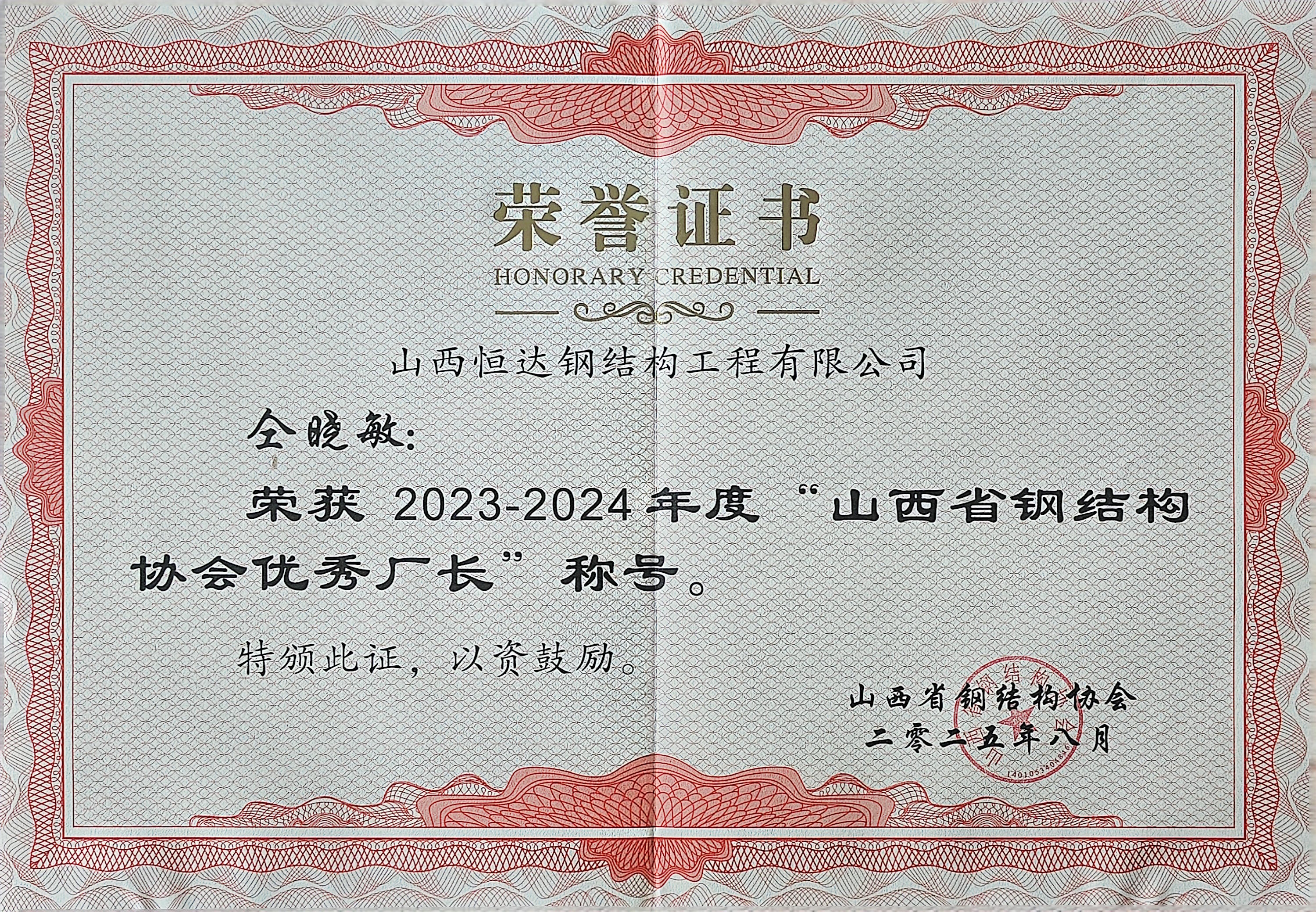 山西恒達(dá)鋼結(jié)構(gòu)仝曉敏獲得2023-2024年度山西省鋼結(jié)構(gòu)協(xié)會優(yōu)秀廠長